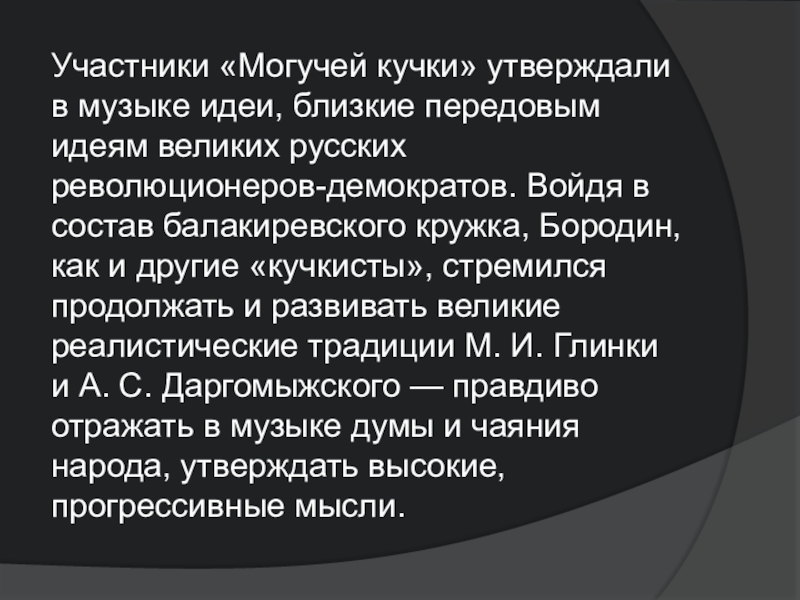 русских революционеров-демократов. Войдя в состав балакиревского кружка, Бородин, как и другие «кучкисты», стремился продолжать и развивать великие реалистические традиции М. И. Глинки и А. С. Даргомыжского — правдиво отражать в музыке думы и чаяния народа, утверждать высокие, прогрессивные мысли.