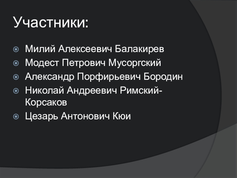Участники:Милий Алексеевич БалакиревМодест Петрович МусоргскийАлександр Порфирьевич БородинНиколай Андреевич Римский-Корсаков Цезарь Антонович Кюи