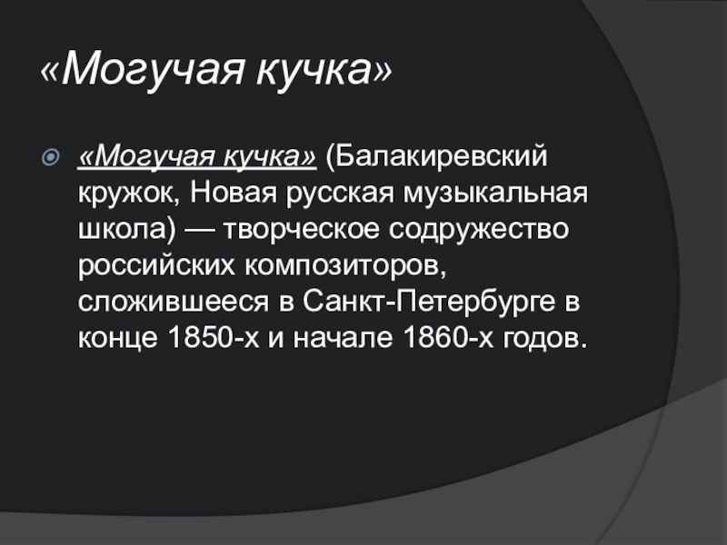 «Могучая кучка»«Могучая кучка» (Балакиревский кружок, Новая русская музыкальная школа) — творческое содружество российских композиторов, сложившееся в Санкт-Петербурге