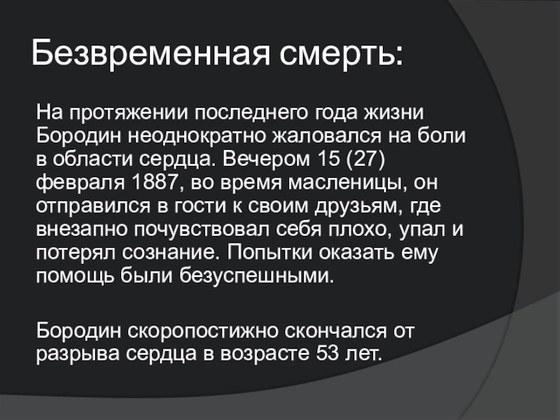 Безвременная смерть: На протяжении последнего года жизни Бородин неоднократно жаловался на боли в области сердца. Вечером 15