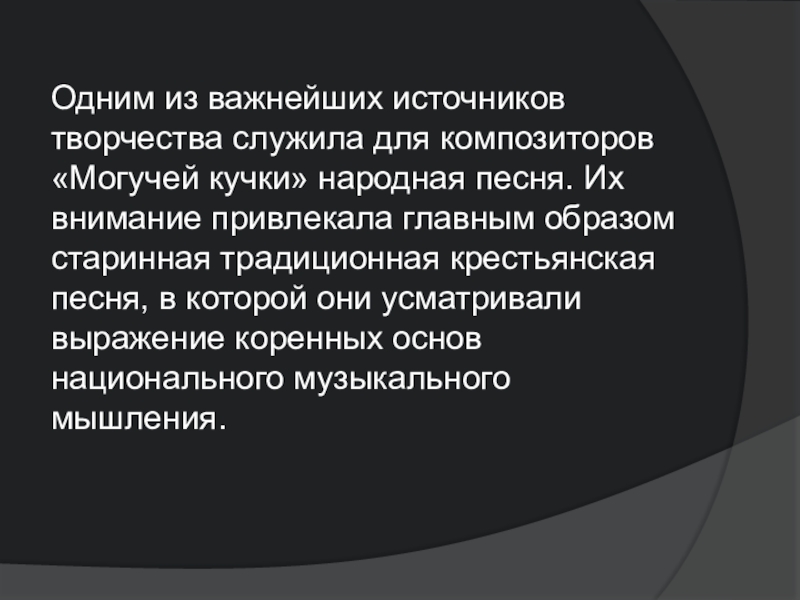Слайд 7Одним из важнейших источников творчества служила для композиторов «Могучей кучки» народная