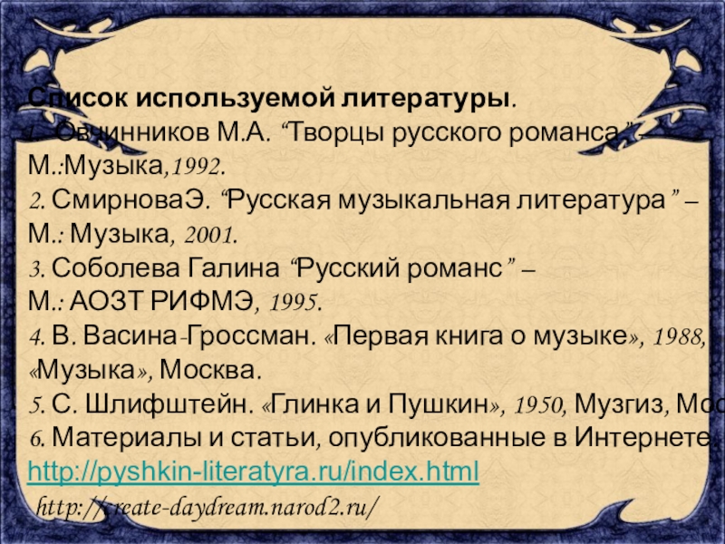 Список используемой литературы.Овчинников М.А. “Творцы русского романса” – М.:Музыка,1992.2. СмирноваЭ. “Русская музыкальная литература” – М.: Музыка, 2001.3.