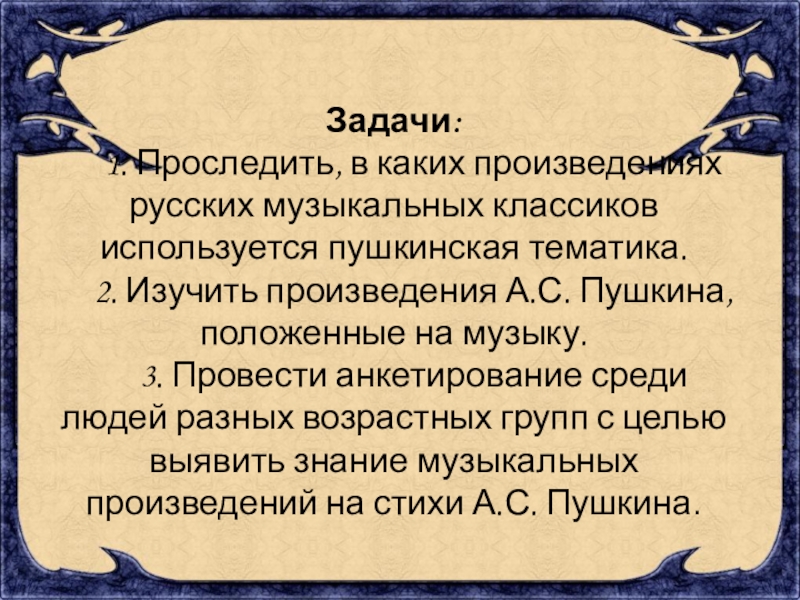 Задачи: 1. Проследить, в каких произведениях русских музыкальных классиков используется пушкинская тематика. 2. Изучить произведения А.С. Пушкина, положенные на музыку. 3. Провести анкетирование среди людей разных возрастных групп с целью выявить знание музыкальных произведений на стихи А.С. Пушкина.