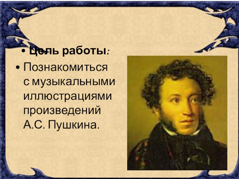 Задачи:	1. Проследить, в каких произведениях русских музыкальных классиков используется пушкинская тематика.	2. Изучить произведения А.С. Пушкина, положенные на