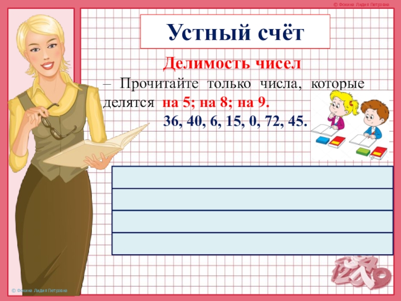 – На 5 делятся числа: 40, 15, 0, 45.