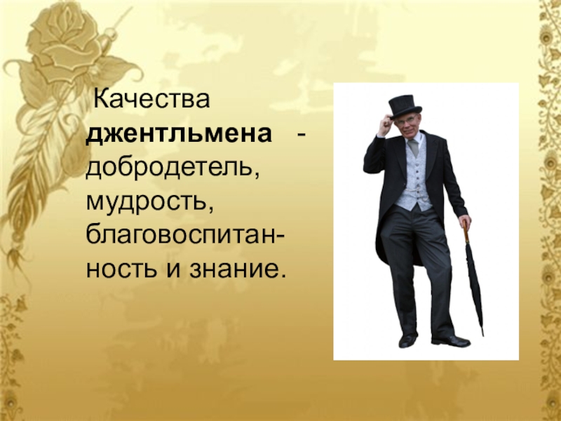 Слайд 13 Качества джентльмена - добродетель, мудрость, благовоспитан- ность и знание.