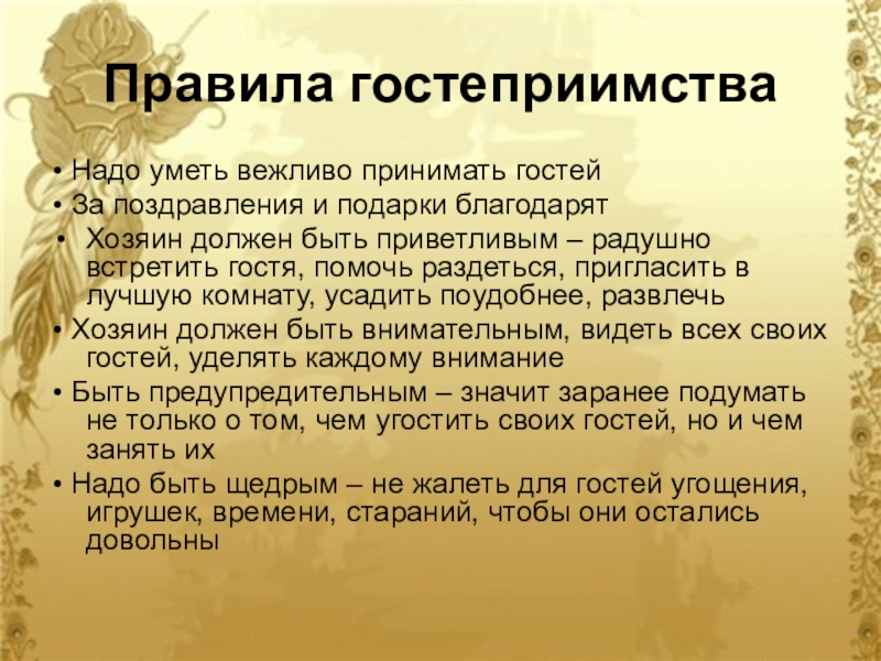 • Надо быть щедрым – не жалеть для гостей угощения, игрушек, времени, стараний, чтобы они остались довольны