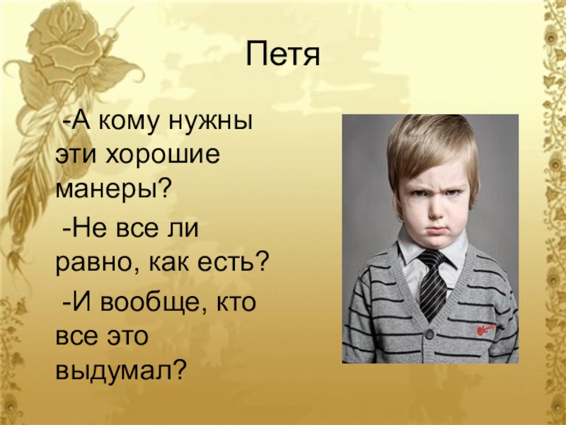 …Неприлично отрокам руками или ногами по столу везде колобродить, но нужно смирно себя вести; а вилками и ножиком по тарелкам не стучать…