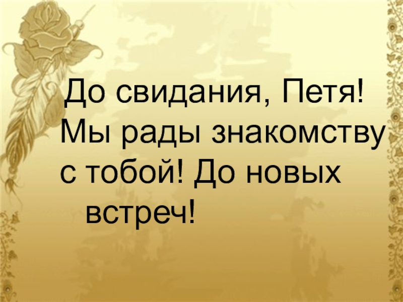 Слайд 20 До свидания, Петя! Мы рады знакомству с тобой! До новых встреч!
