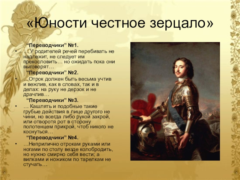 …Отрок должен быть весьма учтив и вежлив, как в словах, так и в делах: на руку не дерзок и не драчлив…