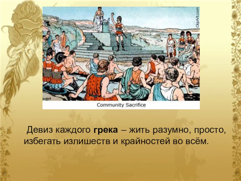 Слайд 11 Девиз каждого грека – жить разумно, просто, избегать излишеств и крайностей