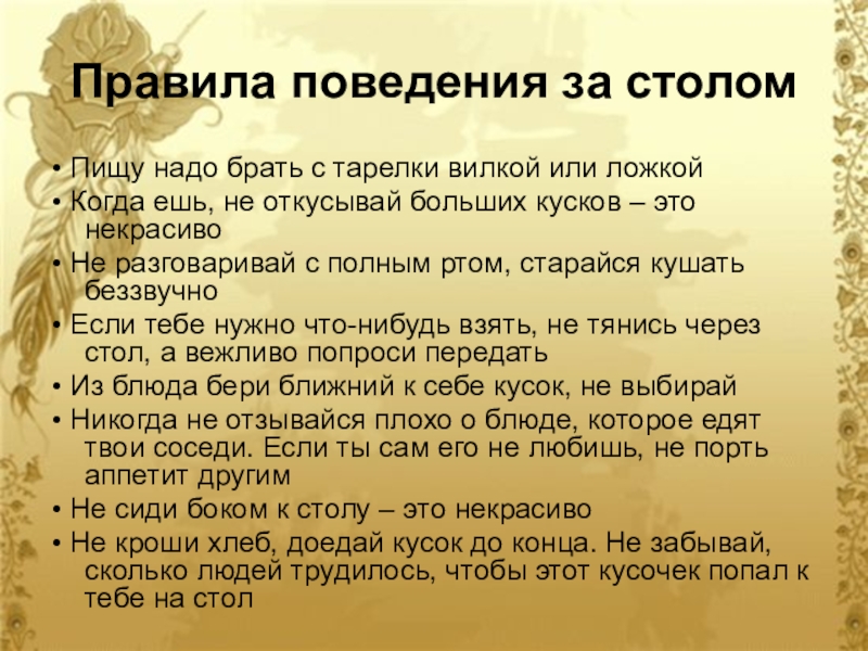 • Если тебе нужно что-нибудь взять, не тянись через стол, а вежливо попроси передать