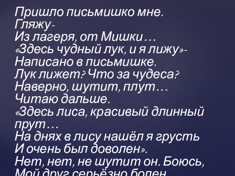 Пришло письмишко мне.Гляжу-Из лагеря, от Мишки…«Здесь чудный лук, и я лижу»-Написано в письмишке.Лук лижет? Что за чудеса?Наверно,