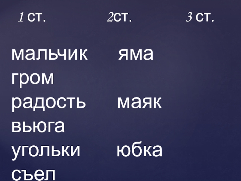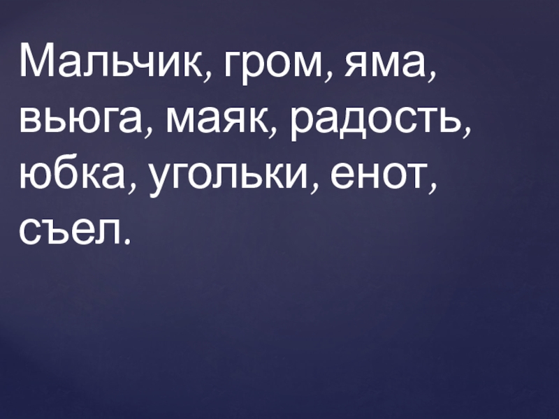 Слайд 3Мальчик, гром, яма, вьюга, маяк, радость, юбка, угольки, енот, съел.