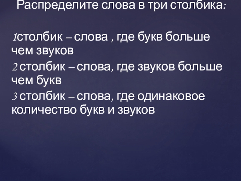 Распределите слова в три столбика: 1столбик – слова , где букв больше чем звуков2 столбик – слова, где звуков больше чем букв3 столбик – слова, где одинаковое количество букв и звуков