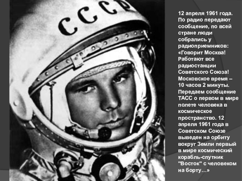 Слайд 812 апреля 1961 года. По радио передают сообщение, по всей стране