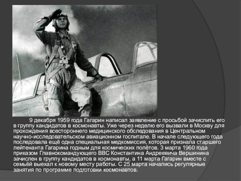 с просьбой зачислить его в группу кандидатов в космонавты. Уже через неделю его вызвали в Москву для прохождения всестороннего медицинского обследования в Центральном научно-исследовательском авиационном госпитале. В начале следующего года последовала ещё одна специальная медкомиссия, которая признала старшего лейтенанта Гагарина годным для космических полётов. 3 марта 1960 года приказом Главнокомандующего ВВС Константина Андреевича Вершинина зачислен в группу кандидатов в космонавты, а 11 марта Гагарин вместе с семьёй выехал к новому месту работы. С 25 марта начались регулярные занятия по программе подготовки космонавтов.