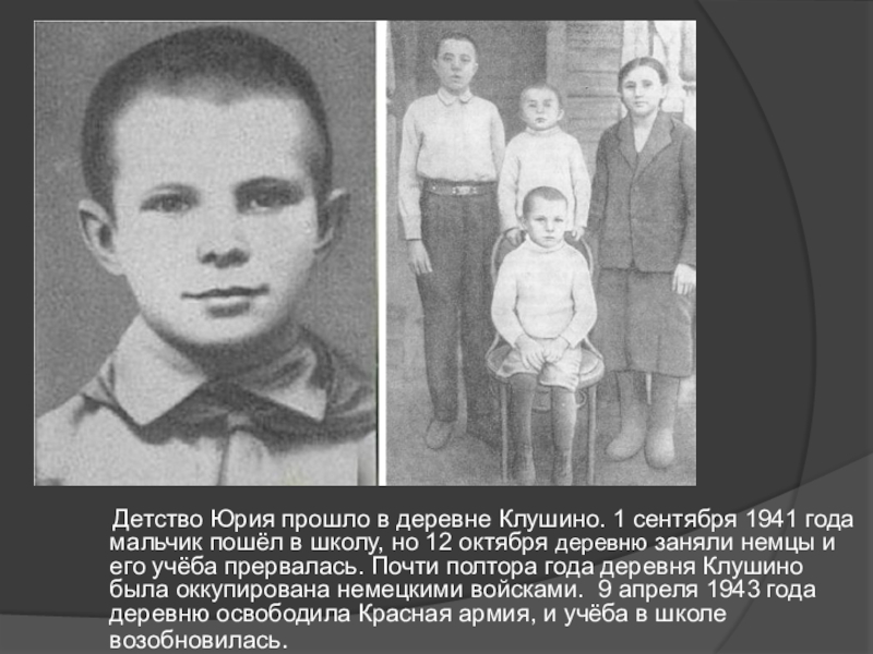 Слайд 4 Детство Юрия прошло в деревне Клушино. 1 сентября 1941 года мальчик