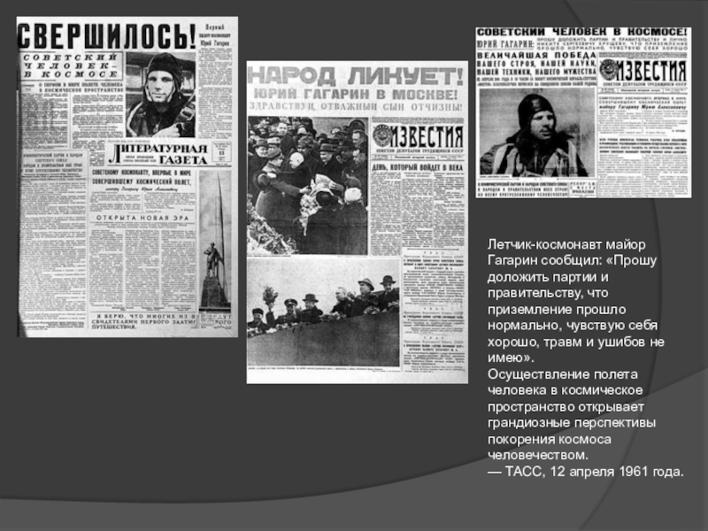 Слайд 12Летчик-космонавт майор Гагарин сообщил: «Прошу доложить партии и правительству, что приземление