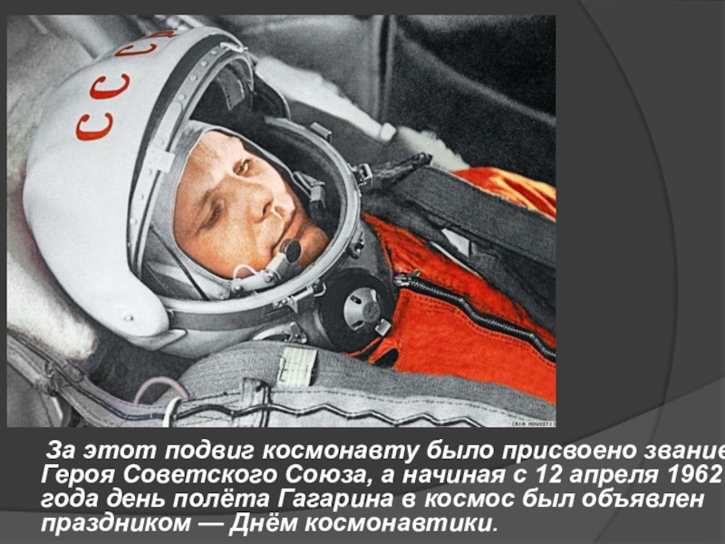 Слайд 10 За этот подвиг космонавту было присвоено звание Героя