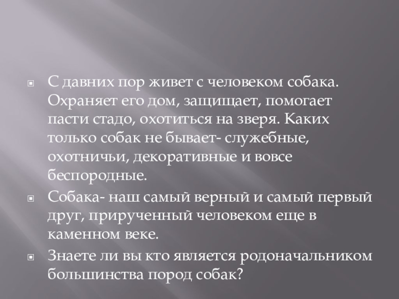 Собака- наш самый верный и самый первый друг, прирученный человеком еще в каменном веке.