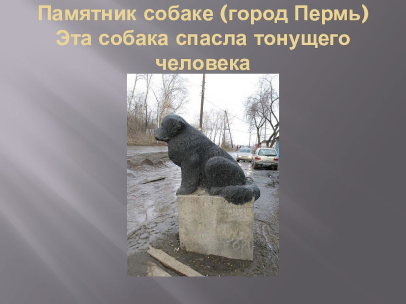 Слайд 65Памятник собаке (город Пермь) Эта собака спасла тонущего человека