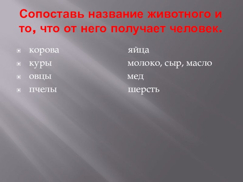 Слайд 3Сопоставь название животного и то, что от него получает человек.