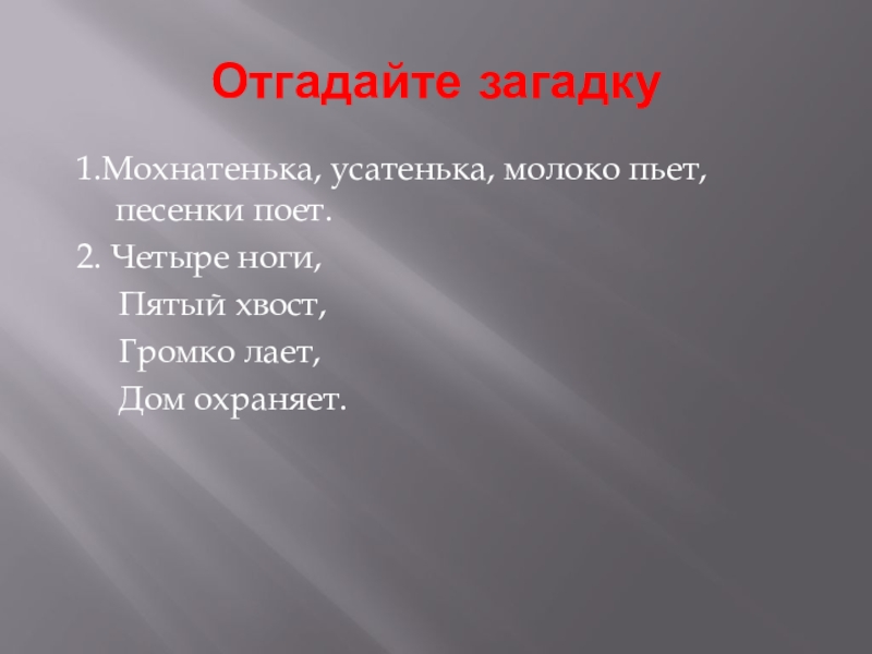 Отгадайте загадку1.Мохнатенька, усатенька, молоко пьет, песенки поет.2. Четыре ноги,   Пятый хвост,   Громко лает,