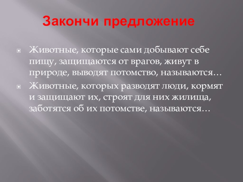 Закончи предложениеЖивотные, которые сами добывают себе пищу, защищаются от врагов, живут в природе, выводят потомство, называются…Животные, которых разводят люди, кормят и защищают их, строят для них жилища, заботятся об их потомстве, называются…