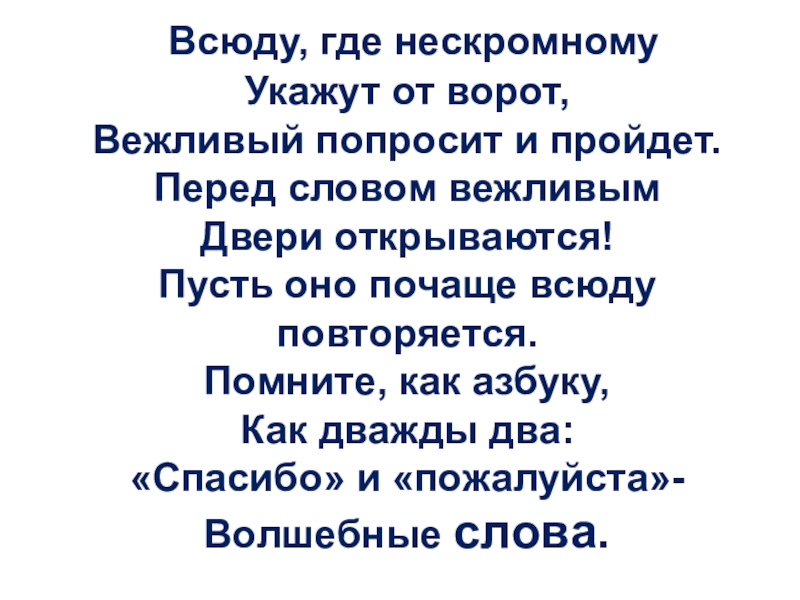 Всюду, где нескромному Укажут от ворот, Вежливый попросит и пройдет. Перед словом вежливым Двери открываются! Пусть