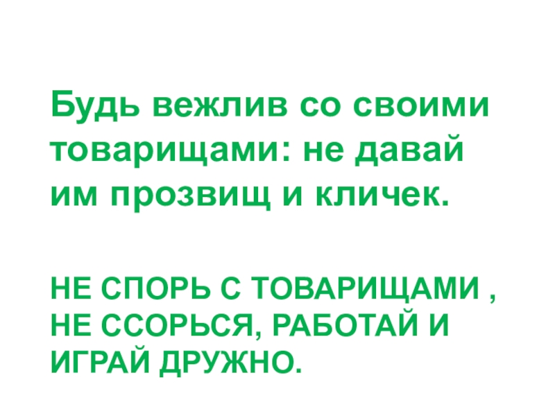 НЕ СПОРЬ С ТОВАРИЩАМИ , НЕ ССОРЬСЯ, РАБОТАЙ И ИГРАЙ ДРУЖНО.Будь вежлив со своими товарищами: не давай
