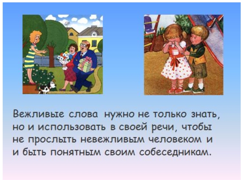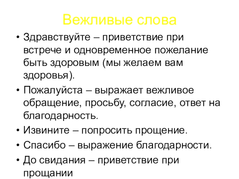 Вежливые словаЗдравствуйте – приветствие при встрече и одновременное пожелание быть здоровым (мы желаем вам здоровья).Пожалуйста – выражает