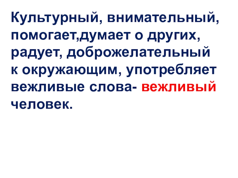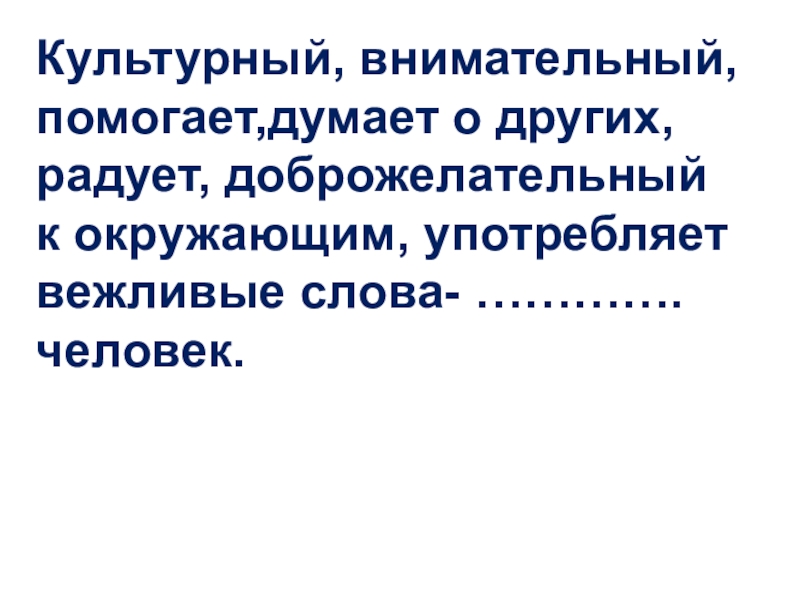 Культурный, внимательный, помогает,думает о других, радует, доброжелательный к окружающим, употребляет вежливые слова- …………. человек.