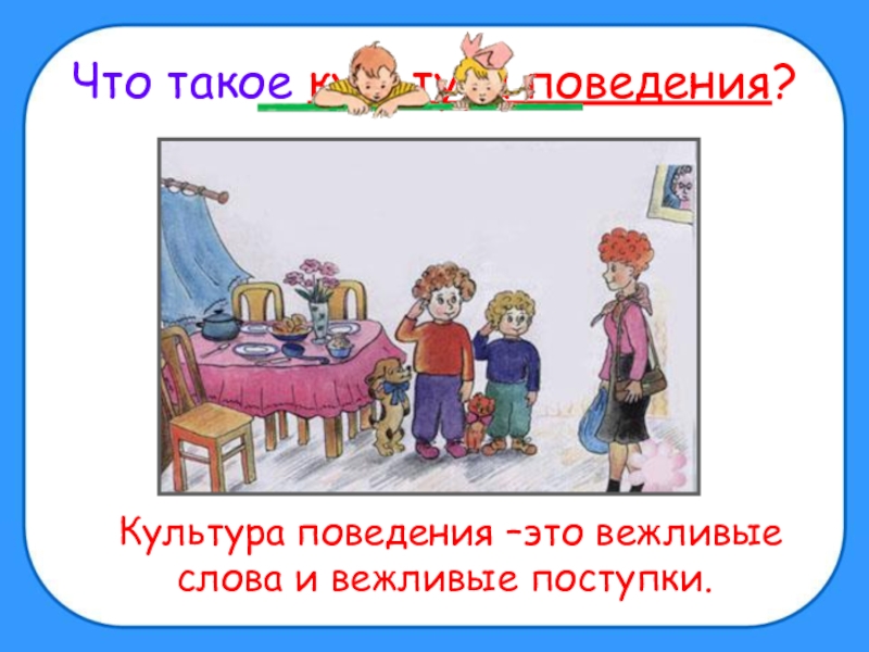 Что такое культура поведения?	Культура поведения –это вежливые слова и вежливые поступки.