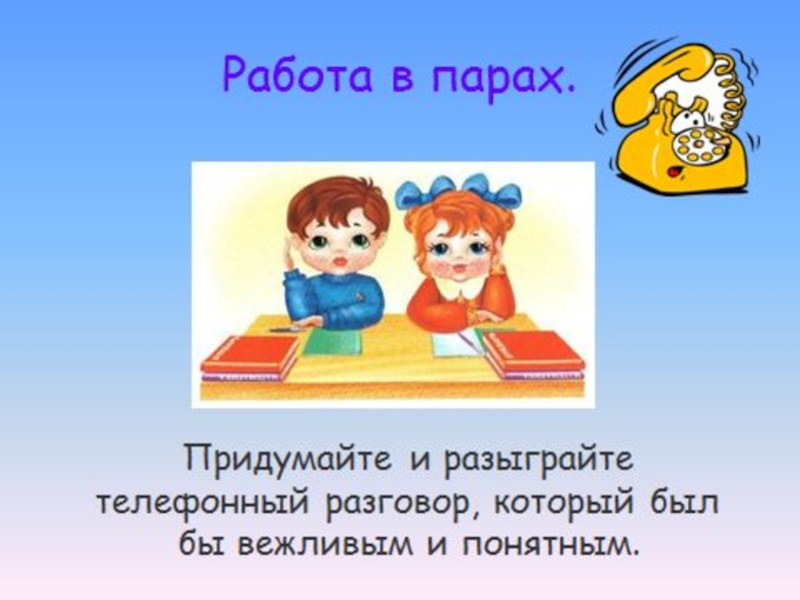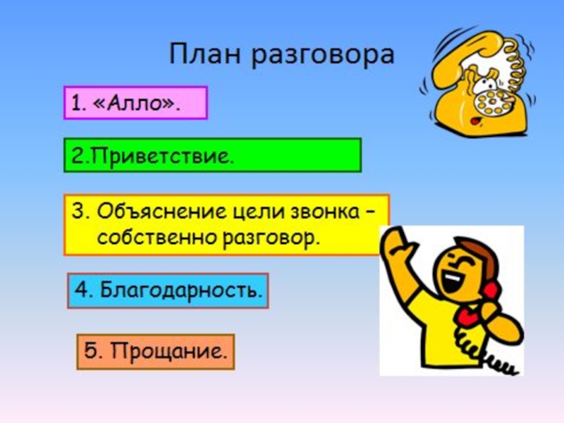 Помни!Разговаривать по телефону нужно вежливым тоном.Использовать слова приветствия, благо-дарности, извинения, прощания.4. Не следует говорить слишком долго.