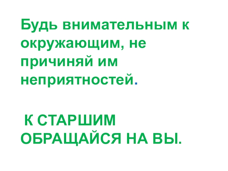 К СТАРШИМ ОБРАЩАЙСЯ НА ВЫ.Будь внимательным к окружающим, не причиняй им неприятностей.