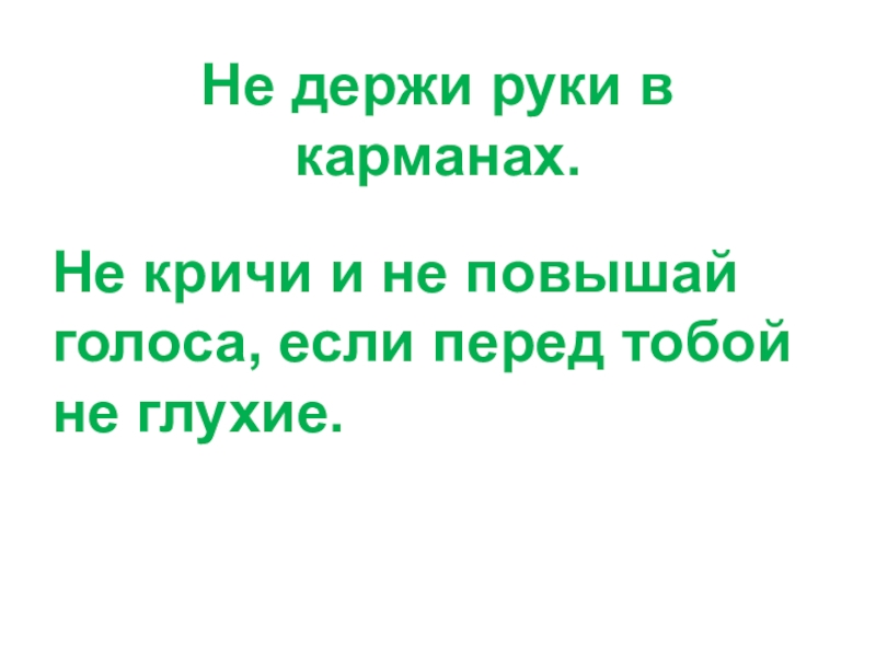 Не держи руки в карманах.Не кричи и не повышай голоса, если перед тобой не глухие.