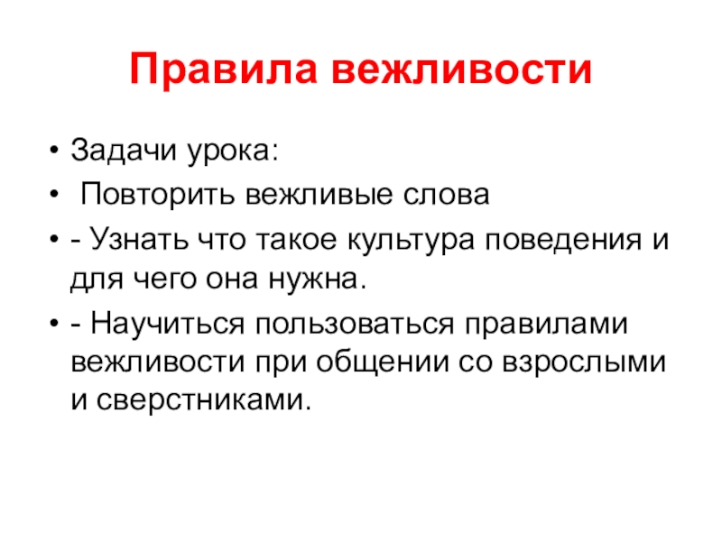 Правила вежливостиЗадачи урока: Повторить вежливые слова- Узнать что такое культура поведения и для чего она нужна.- Научиться