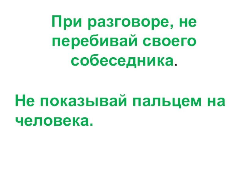 При разговоре, не перебивай своего собеседника.Не показывай пальцем на человека.