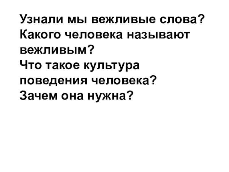Узнали мы вежливые слова?Какого человека называют вежливым?Что такое культура поведения человека?Зачем она нужна?