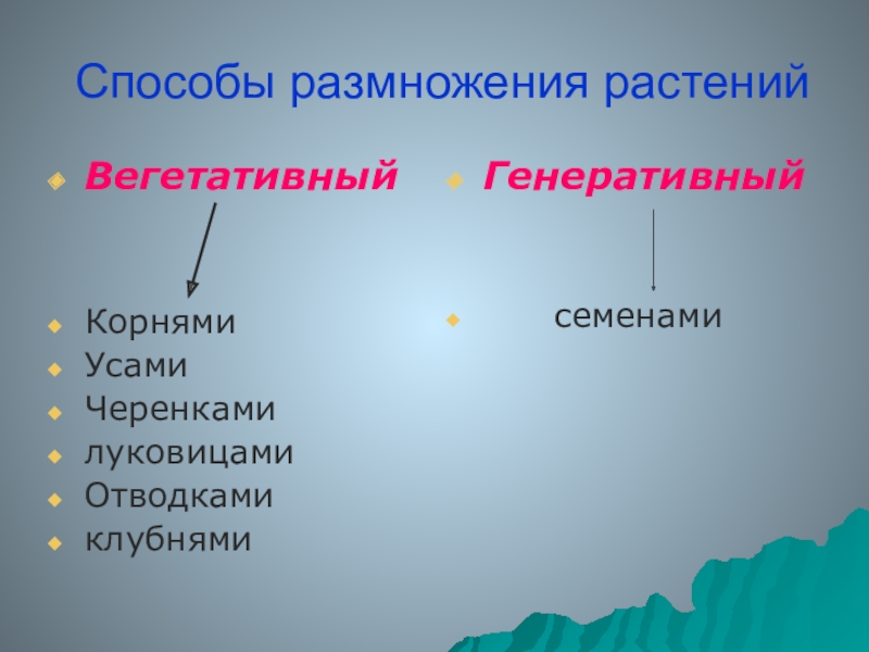 Способы размножения растенийВегетативный КорнямиУсамиЧеренкамилуковицамиОтводкамиклубнямиГенеративный    семенами