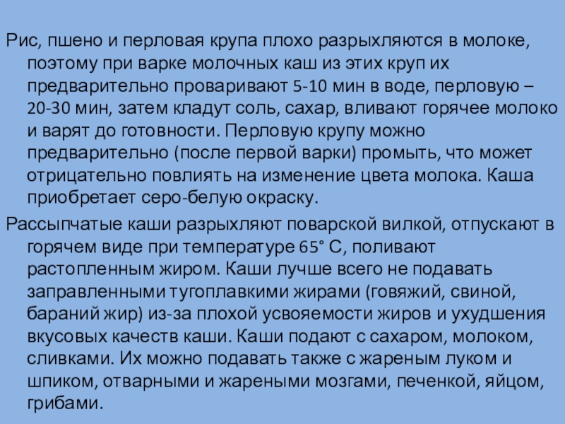 варке молочных каш из этих круп их предварительно проваривают 5-10 мин в воде, перловую – 20-30 мин, затем кладут соль, сахар, вливают горячее молоко и варят до готовности. Перловую крупу можно предварительно (после первой варки) промыть, что может отрицательно повлиять на изменение цвета молока. Каша приобретает серо-белую окраску.