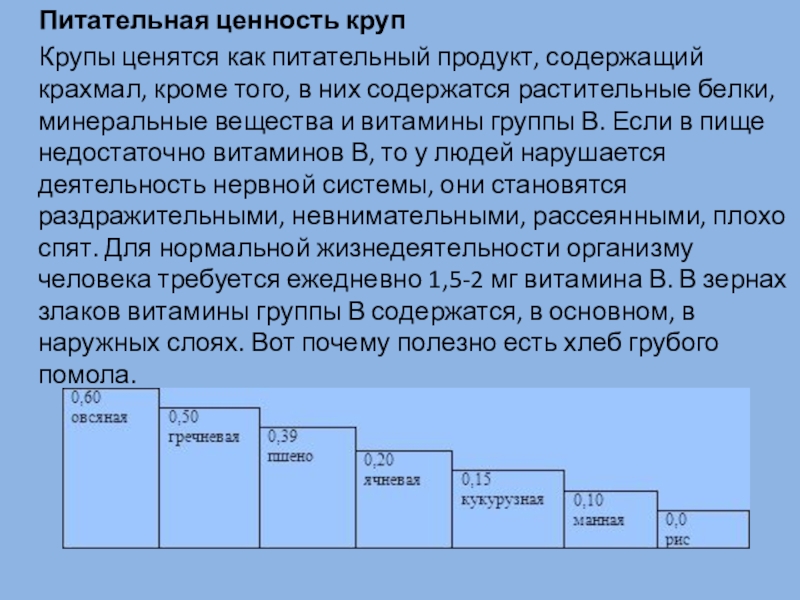 в них содержатся растительные белки, минеральные вещества и витамины группы В. Если в пище недостаточно витаминов В, то у людей нарушается деятельность нервной системы, они становятся раздражительными, невнимательными, рассеянными, плохо спят. Для нормальной жизнедеятельности организму человека требуется ежедневно 1,5-2 мг витамина В. В зернах злаков витамины группы В содержатся, в основном, в наружных слоях. Вот почему полезно есть хлеб грубого помола.