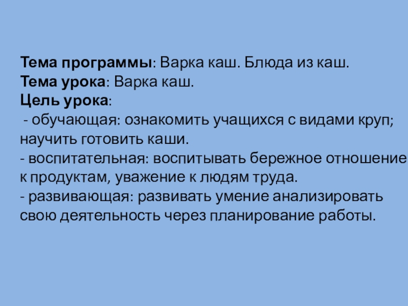 Слайд 2Тема программы: Варка каш. Блюда из каш.