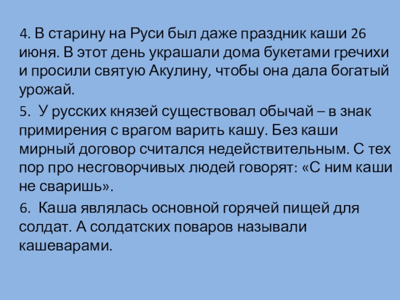 5. У русских князей существовал обычай – в знак примирения с врагом варить кашу. Без каши мирный договор считался недействительным. С тех пор про несговорчивых людей говорят: «С ним каши не сваришь».