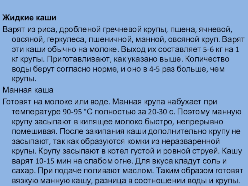 пшеничной, манной, овсяной круп. Варят эти каши обычно на молоке. Выход их составляет 5-6 кг на 1 кг крупы. Приготавливают, как указано выше. Количество воды берут согласно норме, и оно в 4-5 раз больше, чем крупы.