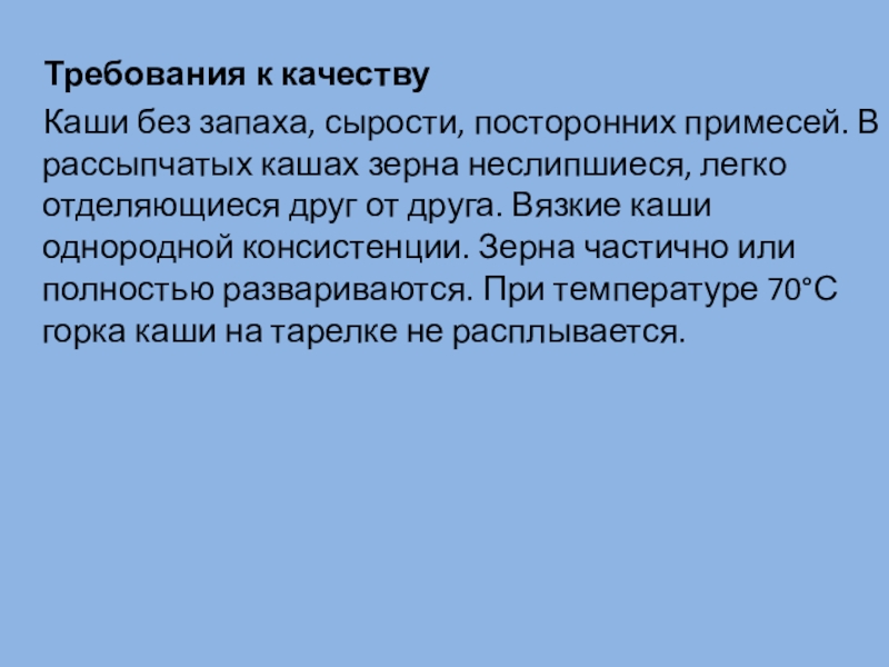 зерна неслипшиеся, легко отделяющиеся друг от друга. Вязкие каши однородной консистенции. Зерна частично или полностью развариваются. При температуре 70°С горка каши на тарелке не расплывается.