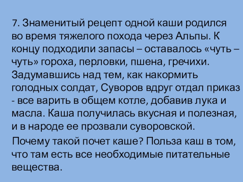 К концу подходили запасы – оставалось «чуть – чуть» гороха, перловки, пшена, гречихи. Задумавшись над тем, как накормить голодных солдат, Суворов вдруг отдал приказ - все варить в общем котле, добавив лука и масла. Каша получилась вкусная и полезная, и в народе ее прозвали суворовской.