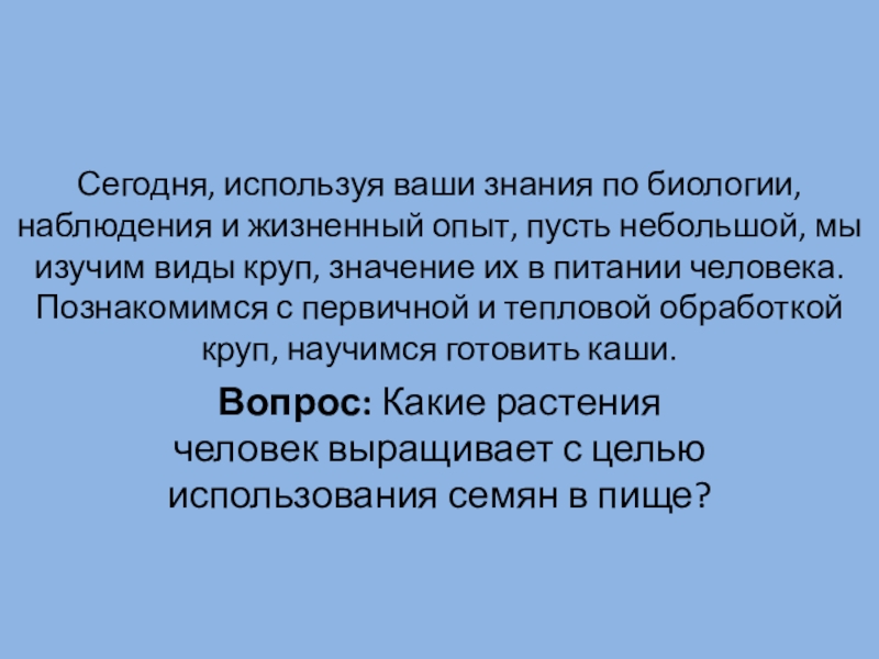 небольшой, мы изучим виды круп, значение их в питании человека. Познакомимся с первичной и тепловой обработкой круп, научимся готовить каши.