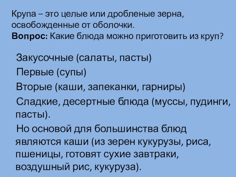 Слайд 7Крупа – это целые или дробленые зерна, освобожденные от оболочки.